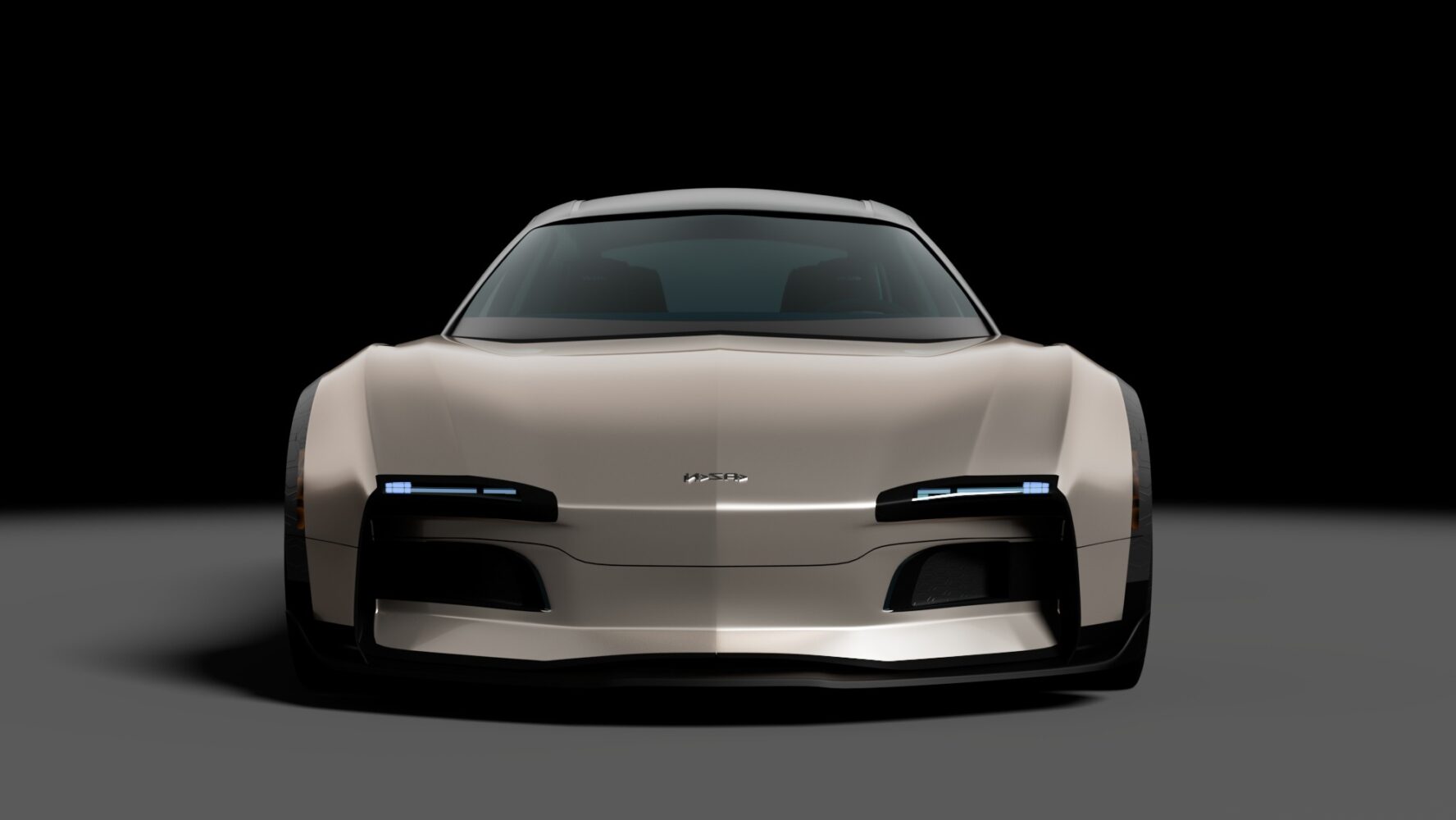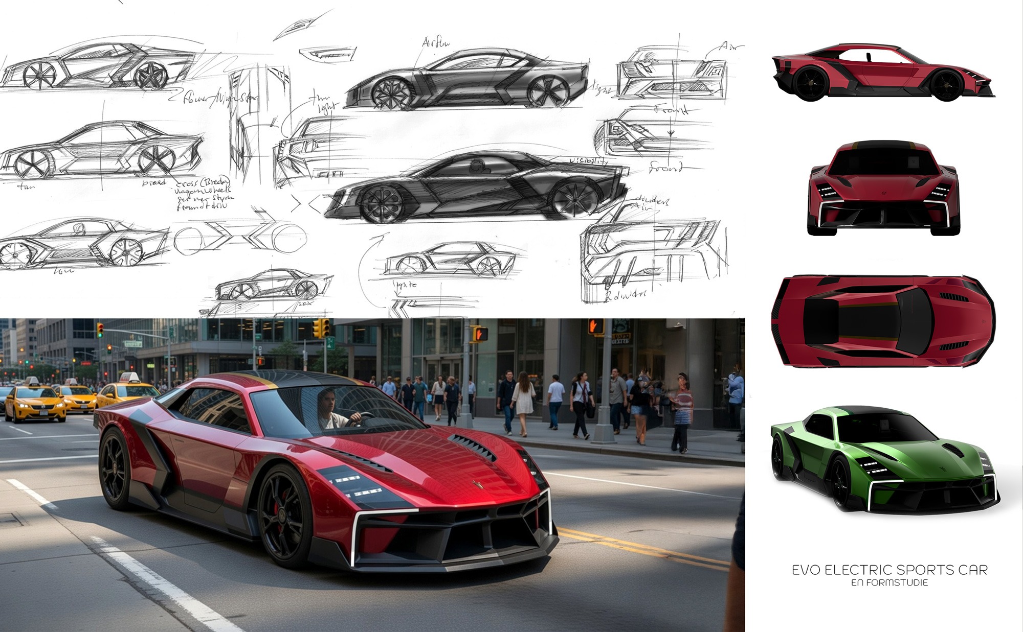 Design av familjesportbil, med fyra stolar, och där designen är riktad mer mot elegans men som samtidigt har en sportig framtoning. (bild framtagen med Maya/Arnold, video med AI)