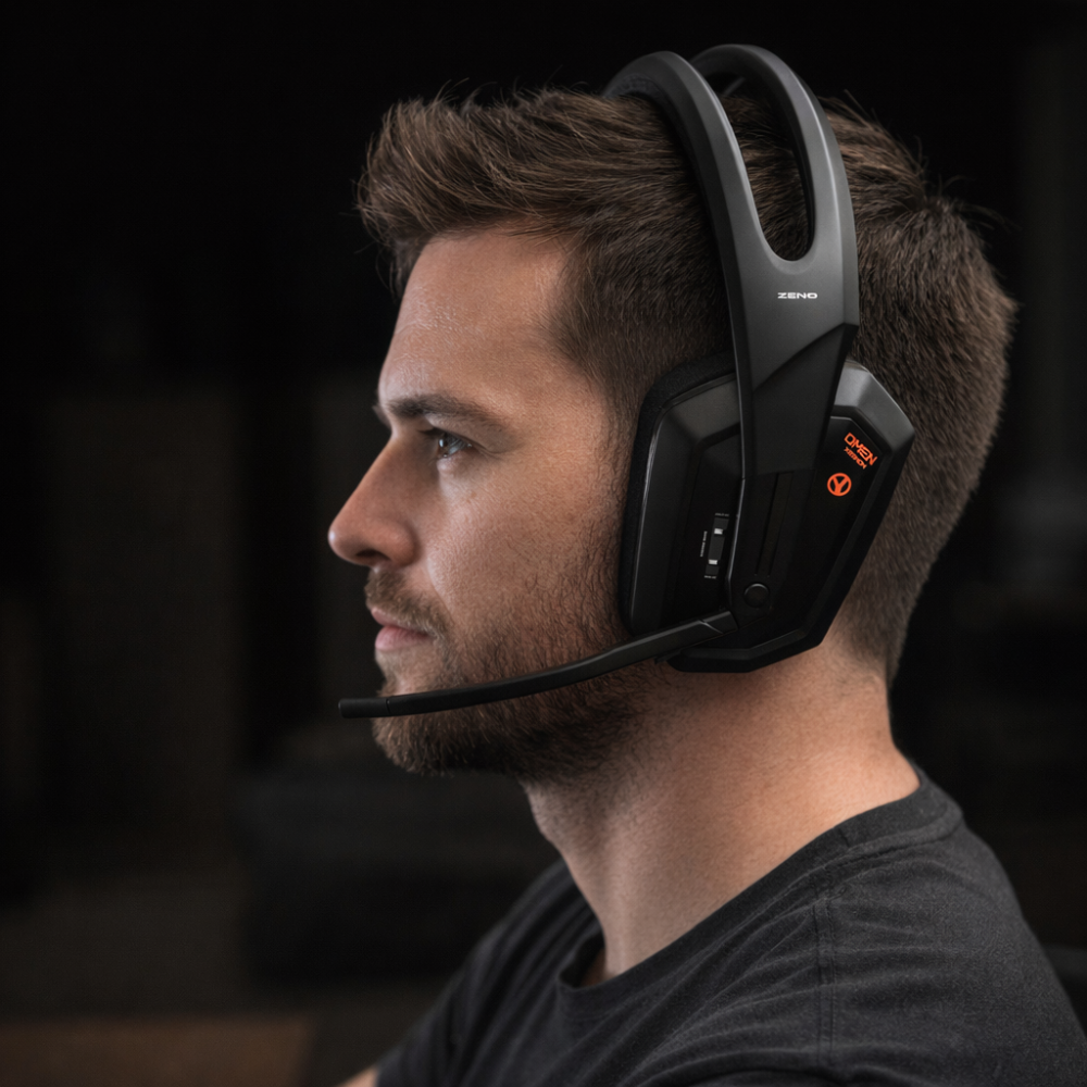 Headset för spelande. En stadig konstruktion som väger lätt. Delat huvudband för att minsta tryck och förbättra luftcirkulation samt öka stabilitet. Snabbåtkomstknappar på kåporna. (bild Microsoft 365)