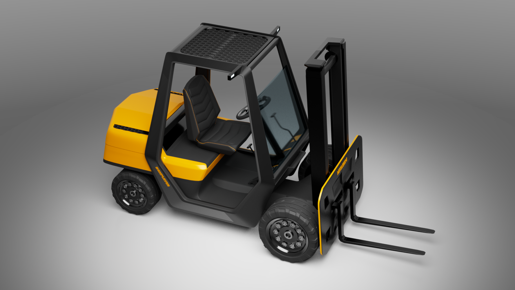 Ramen runt sittbrunnen bildar en box när man ser hytten från sidan, och produktfamiljen får namnet "Boxplayer". Ett exempel på varumärkesutveckling och en tydlig stil för produkten vilket skapar igenkänning och trygghet och trovärdighet hos en kund. (bild framtagen i Maya och renderad med Arnold)
