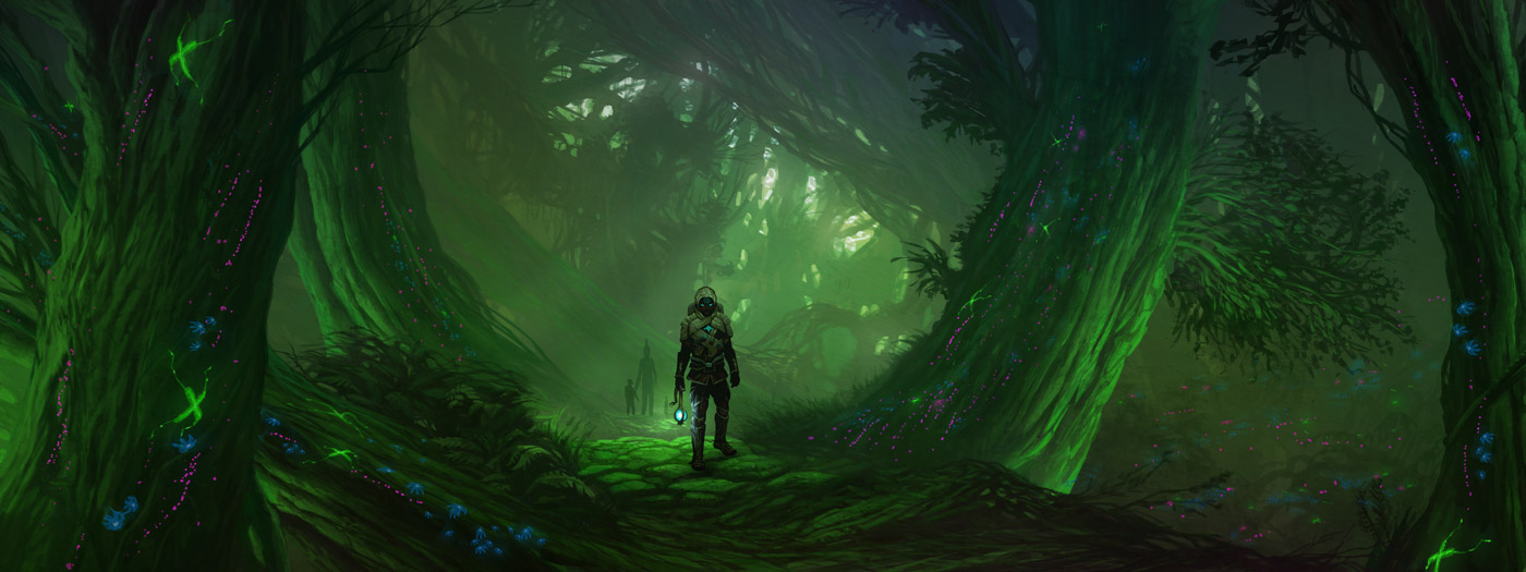 En bild för spel, som jag retuscherat något i efterhand och som är skapad med Wacom platta. Tanke här var att skapa en mysig magisk spännande värld. Det finns lysande organiska delar och dramatiskt ljus från olika håll för att öka på känslan av mystik, dvs det ser ut att hända något utanför bilden också.